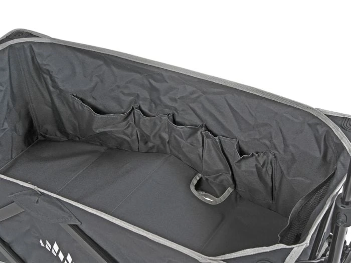 LâintĂ©rieur du chariot a une taille de 90 x 45 x 30 cm et est fabriquĂ© en polyester robuste. Le fond est renforcĂ© pour une assise confortable. LâintĂ©rieur comporte Ă©galement plusieurs compartiments oĂč vous pouvez ranger de petits objets. AprĂšs utilisation, vous pouvez facilement plier le chariot Air Wheels et le ranger dans le sac de rangement fourni.