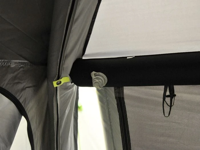 Les arceaux gonflables assurent une structure stable et sont dotés d’un revêtement ultra-résistant, ce qui les rend presque indestructibles. L’avantage des tubes à air est leur capacité de fléchir légèrement sous les coups de vent et à reprendre toujours leur forme et leur position d’origine. Vous n’avez donc pas à vous soucier des arceaux de tente pliés ou cassés. Pour une stabilité supplémentaire, cet auvent est équipé de deux longerons de toit gonflables.