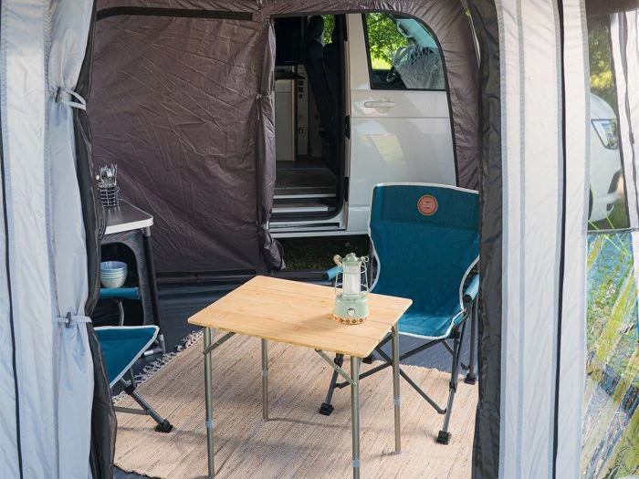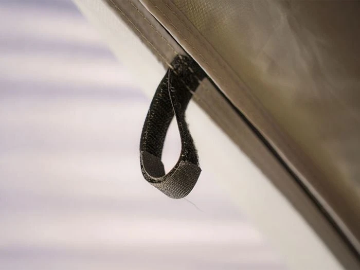 Le grand rabat de connexion situé à l’arrière permet de le fixer sur la quasi-totalité des vans, fourgons ou camping-cars, tout en laissant suffisamment d’espace pour une porte battante. Ce rabat peut être fixé de 180 à 280 centimètres et se fixe au véhicule de différentes façons : vous pouvez le tendre sur le toit à l’aide des haubans ou utiliser ses deux joncs et ses bandes velcro. Si votre fourgon ou camping-car est équipé d’une galerie de toit, vous pouvez fixer le rabat de connexion à la galerie avec les bandes velcro. Si votre véhicule est équipé d’un store à cassette ou d’un rail, les joncs peuvent y être insérés.