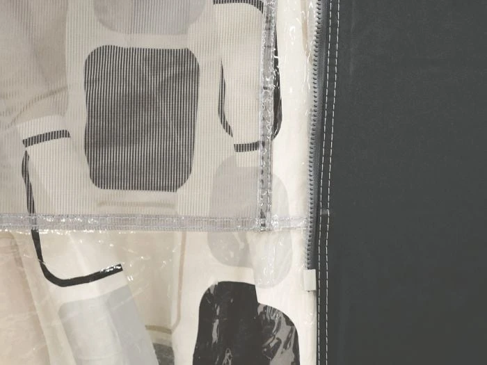 Les parois frontales et latérales peuvent être complètement déroulées, ce qui permet d’utiliser le toit comme une solette. Toutes les parois peuvent être légèrement enroulées, ce qui vous donne pas moins de 4 endroits différents pour entrer dans l’auvent ! Une bonne ventilation est très importante dans un auvent. C’est pourquoi il y a une ouverture d’aération dans le faîte sous l’auvent et les deux fenêtres latérales sont équipées d’une moustiquaire avec un rabat transparent. Les coins avant sont munis de boucles permettant de fixer une sangle anti-tempête (non fournie).