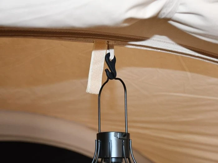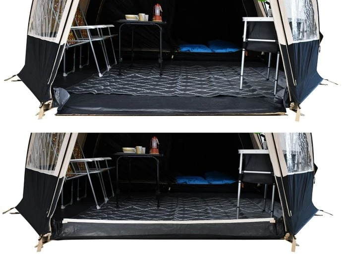 Elle est équipée d’un tapis de sol cuvette fixe, solidement cousu au double toit sur toute la surface de la tente. Cette caractéristique empêche l’eau de pénétrer à l’intérieur en cas de pluie, assurant ainsi que vos pieds et vos affaires restent bien au sec. Ce tapis de sol cuvette fixe a pour autre avantage d’empêcher les insectes et les nuisibles de pénétrer dans la tente. À l’entrée de la tente, le tapis de sol est rabattable pour écarter tout risque de trébuchement.