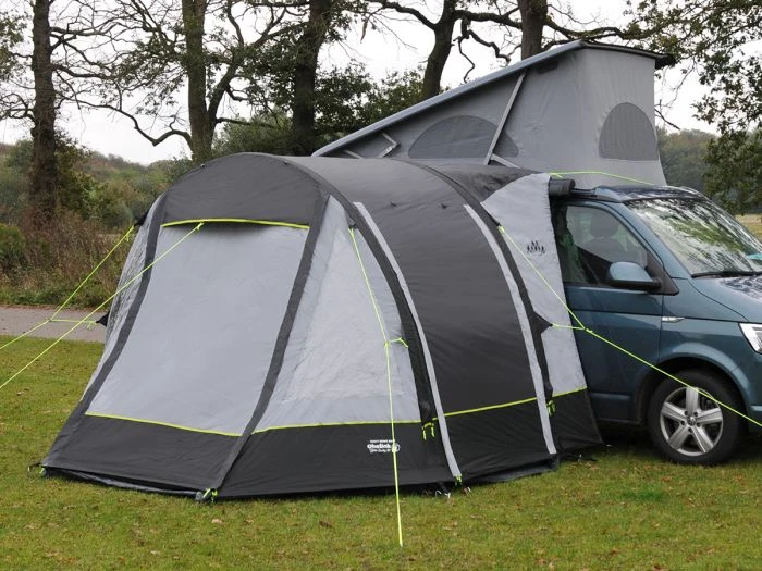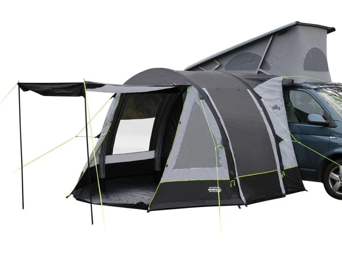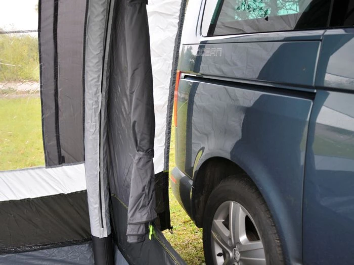 Le Trinity Easy Air est un auvent fourgon qui peut être placé sur le côté des fourgons. Il y a un rabat de connexion à l’arrière qui vous permet d’attacher l’auvent au véhicule. Le rabat de connexion du Trinity Easy Air est pourvu de différentes options de fixation selon les possibilités du fourgon. Par exemple, vous pouvez tendre le rabat avec des cordes par-dessus le toit du fourgon. Votre fourgon est-il équipé d’une gouttière ? Vous pouvez alors fixer le rabat dans la gouttière à l’aide de la barre de liaison et des pinces fournies. Vous n’avez pas de gouttière ? Vous pouvez également fixer la barre de liaison avec des ventouses optionnelles. Votre fourgon est-il équipé d’un rail de toit ou d’une galerie de toit ? Vous pouvez alors fixer le rabat à l’aide des fermetures velcro intégrées. Le rabat est également équipé d’un jonc de 5 mm et de 7 mm, de sorte d’également pouvoir glisser le rabat directement dans un rail de tente ou un store cassette. Vous souhaitez aussi pouvoir vous déplacer avec votre fourgon ? Utilisez alors un adaptateur de jonc optionnel.