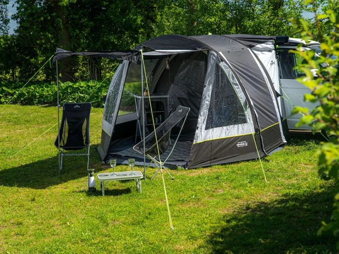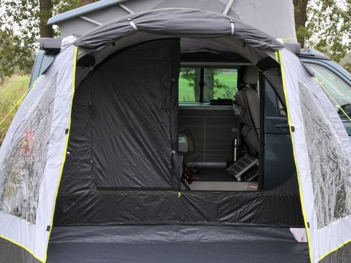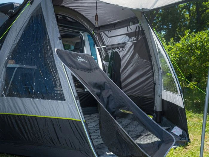 La ventilation est très importante pour un climat de vie agréable dans la tente. C’est pourquoi le Trinity Easy Air est équipé de différentes options de ventilation. Par exemple, il y a une ouverture de ventilation couverte dans la porte d’entrée. Ainsi, vous pouvez ventiler l’auvent en permanence, même lorsqu’il pleut. De plus, la fenêtre latérale gauche est à moitié équipée de moustiquaire. Lorsque vous avez besoin de beaucoup d’air frais, vous pouvez enrouler votre porte d’entrée et votre porte latérale. La paroi à l’arrière peut aussi entièrement être ouverte.