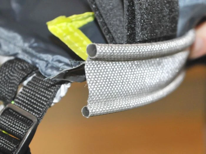 Le seul arceau qu’il reste est celui pour la solette, un arceau en fibre de verre est fourni que vous pouvez facilement glisser dans la fente et fixer dès que le reste de l’auvent est gonflé.