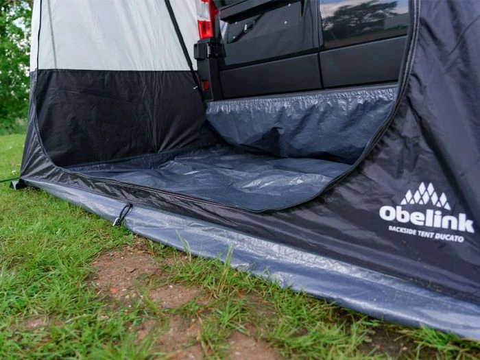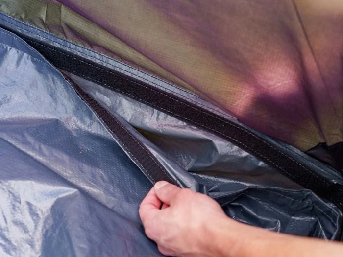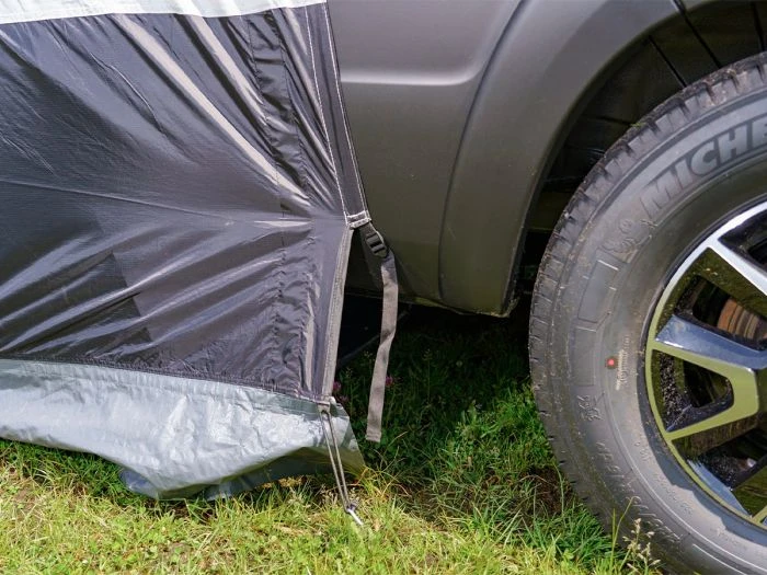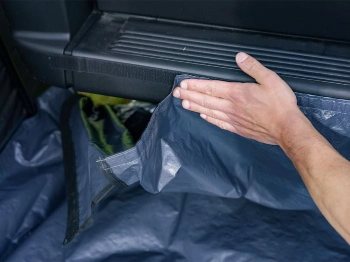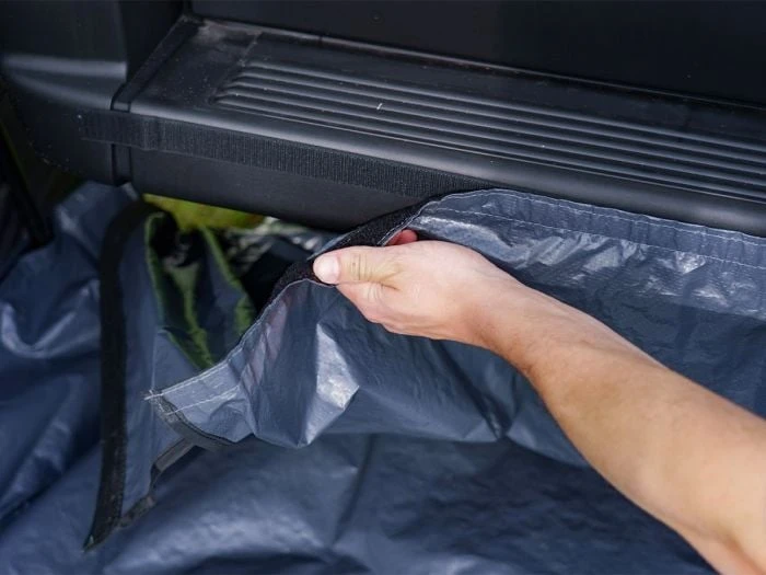 Le tapis de sol fourni a un bord surélevé équipé d’une fermeture Velcro tout autour pour une connexion étanche avec la tente. Une bande Velcro autocollante est également incluse que vous pouvez coller une seule fois sur le pare-chocs du camping-car. Vous pouvez également fixer le tapis de sol au pare-chocs pour sceller le dessous du camping-car.