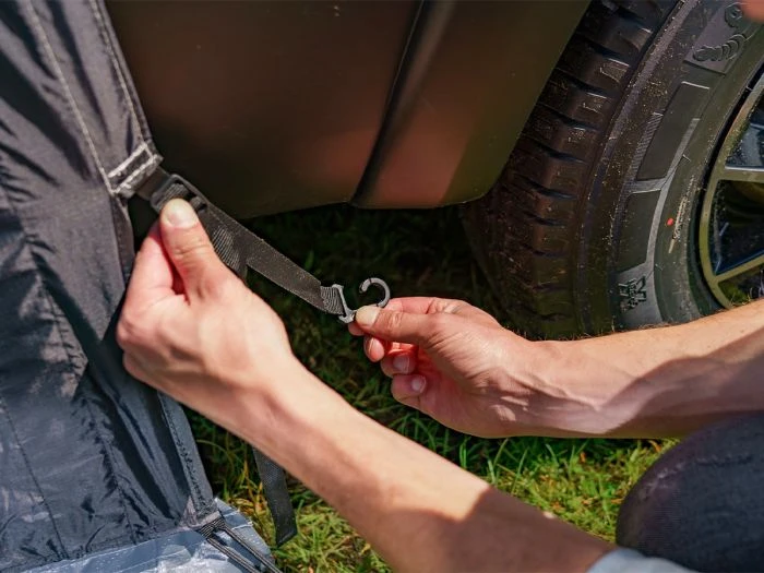Vous souhaitez connecter et déconnecter l’auvent régulièrement ? Optez alors pour une fixation flexible avec des cordes, un adaptateur de jonc ou un adaptateur magnétique.